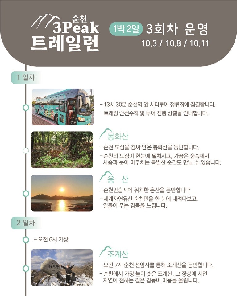주요 일정은 ▲봉화산 정상에서 내려다보는 순천 도심의 전경 ▲순천만 용산에서 감상하는 세계자연유산의 황홀한 일몰 ▲선암사를 품은 조계산의 고즈넉한 풍광 체험 등으로 구성됐으며, 추석 연휴인 10월 3~4일, 8~9일, 11~12일 총 3회 운영된다.