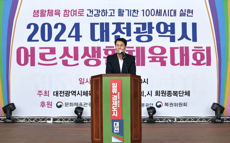 [대전 세계타임즈=이채봉 기자] 대전시의회 이상래 의장은 9일 엑스포시민광장에서 개최된 ‘2024년 대전광역시 어르신 생활체육대회’에 참석해 대전광역시체육회 이승찬 회장을 비롯한 관계자와 인사를 나누고 대회 참가자에게 응원의 메시지를 전했다.