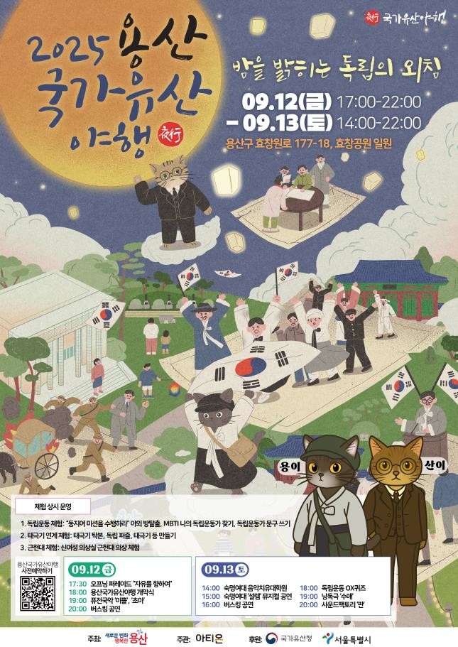 박희영 용산구청장은 “광복 80주년을 맞아 독립운동 성지 효창공원에서 열리는 이번 야행은 순국선열의 뜻을 기리고 국가유산의 가치를 되새기는 특별한 시간이 될 것”이라며 “많은 구민들이 함께하여 역사의 의미를 나누길 바란다”라고 말했다.