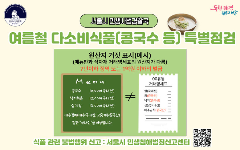 서울시 민생사법경찰국은 지난 6~7월 초까지 콩국수.냉면 판매 음식점 및 육수 제조가공업소 총 91개소를 사전점검하고 이 중 17개소를 특별점검한 결과, 위반 업체 2개소를 적발했다고 밝혔다.