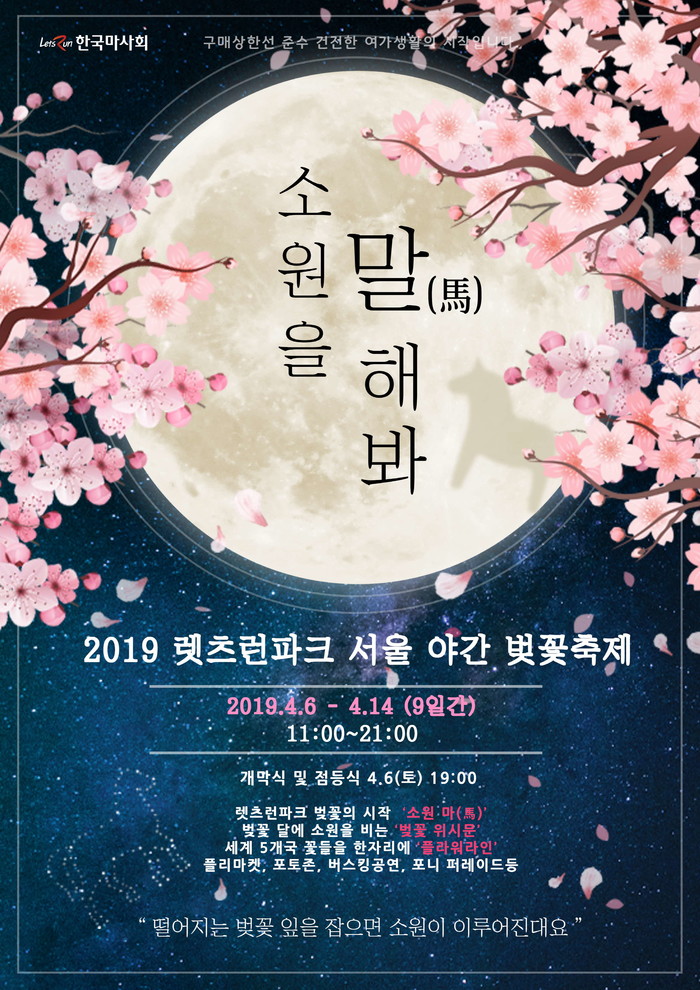 2019년도 벚꽃축제는 ‘소원이 이루어지는 곳’이란 콘셉트로 진행되며 5m 높이의 초대형 위시문(Wish Moon) 포토존 및 각종 소원 이벤트를 통해 벚꽃 풍경에 정취를 더할 예정이다. 이외에도 렛츠런파크 서울에서만 볼 수 있는 포니 퍼레이드와 함께 무료입장 이벤트를 통해 경마 경주까지 즐길 수 있다.