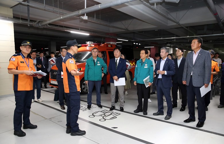 먼저 건소위는 내포신도시에 위치한 아파트 지하주차장 전기자동차 화재 대응훈련 및 화재진압 시연회에 참석했다. 이날 소방본부는 현장에서 전기자동차 화재진압 시연(질식소화포‧상방방사관창‧워터포켓)을 통해 화재진압 기술을 선보였다. 시연회는 최근 친환경 전기자동차 증가 추세에 따라 공동주택 지하주차장 등 전기자동차 화재 발생 시 효율적인 대응을 위해 마련됐다.