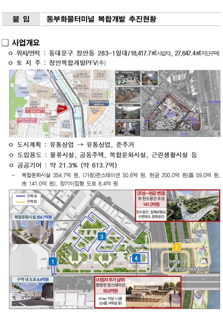 - 총 613.7억 원 규모 공공기여, 주민복합문화시설, 중랑천 친수공간 등 조성 예정