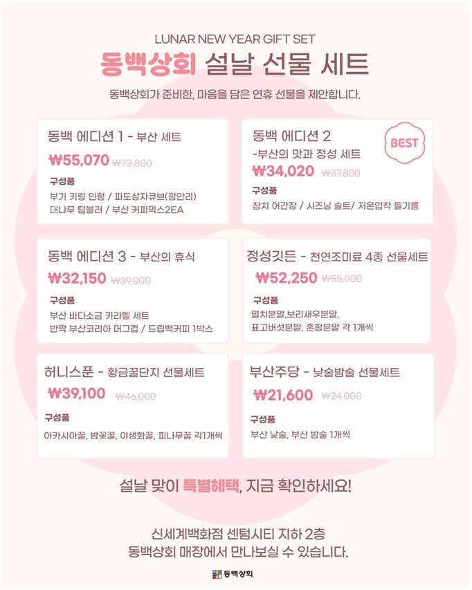 ◈ 설 '선물 세트'는 명절 선물로 적합한 품목을 엄선해 총 6종으로 구성… [소비자] 다양한 제품 경험 기회 [지역기업] 공동 홍보 및 매출 확대 효과 [세계타임즈=부산 이용우 기자] 부산시(시장 박형준)와 부산경제진흥원(원장 송복철)은 부산 우수 제품 쇼핑 숍 「동백상회」에서 설 명절을 앞두고 지역기업 제품으로 구성된 '선물 세트'를 출시하고, 동백상회 제품 구매 고객 대상 사은품 증정 행사를 진행한다고 밝혔다.