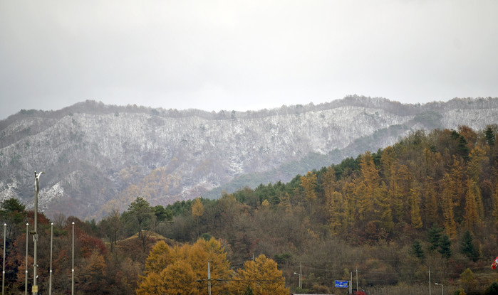 | ▲전날 내린 눈이 쌓여 단풍과 함께 대비되는 색을 보여주고 있는 팔공산 |