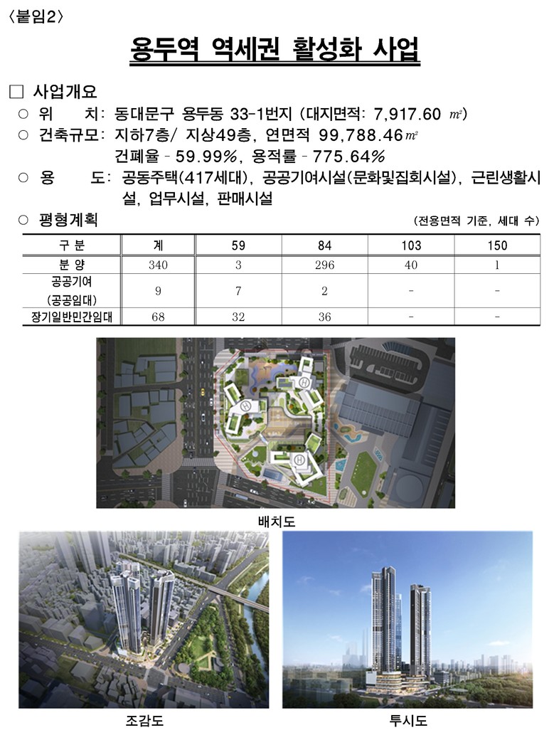 동대문구 용두동 33-1번지 일대는 지하 7층, 지상 49층 규모로 3개 동 417세대(공공임대 9세대, 민간임대 68세대 포함)를 공급한다. 문화·집회시설 등 공공기여시설과 근린생활·업무시설 등을 함께 조성한다.