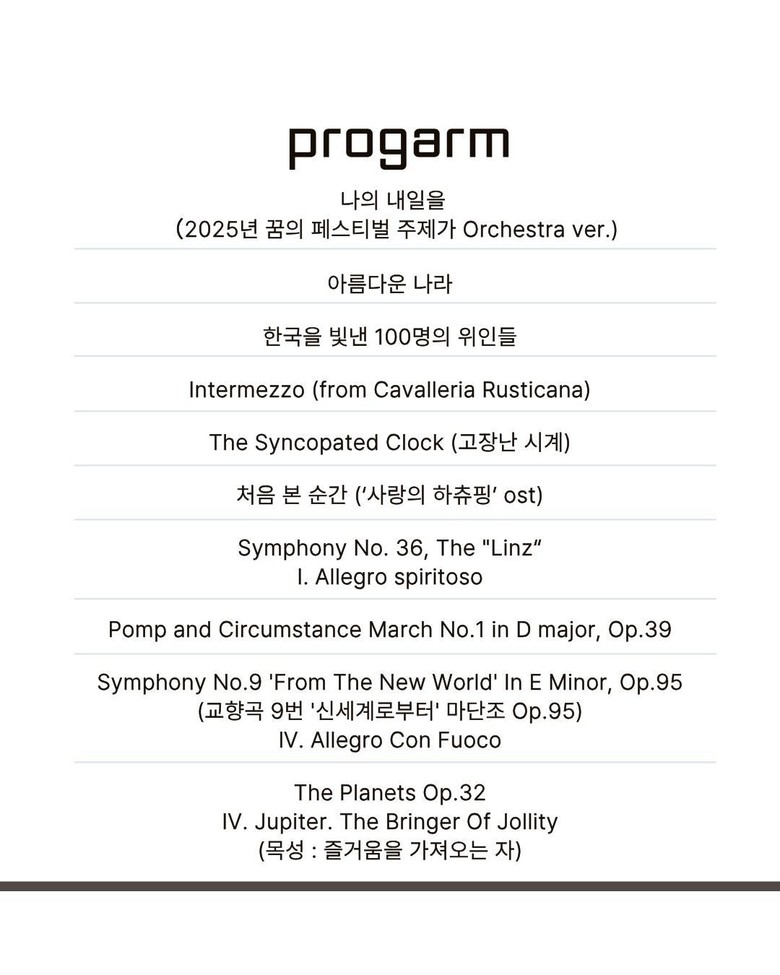 최지환 감독의 지휘로 진행되는 이번 연주회는 대중가요부터 모차르트, 드보르작, 홀스트 등 클래식 명곡까지 다채로운 선곡으로 구성돼 관객들에게 풍성한 감동을 선사할 것으로 기대된다.