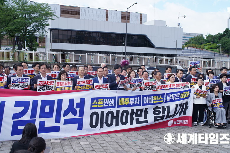 국민의힘 의원들이 1일 오전 서울 용산구 대통령실 앞에서 열린 현장 의원총회를 열었다.세계타임즈 / 신상철 기자 news@thesegye.com