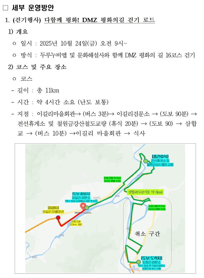 디엠지(DMZ) 평화의 길 16코스는 철원 두루미평화타운에서 남대천교까지 약 21.2km 구간으로, 대부분이 민간인통제구역(CCA) 내에 위치한다. 이번 행사에서는 이길리 검문소부터 삼합교 인근까지 약 7km 구간을 함께 걷는다.