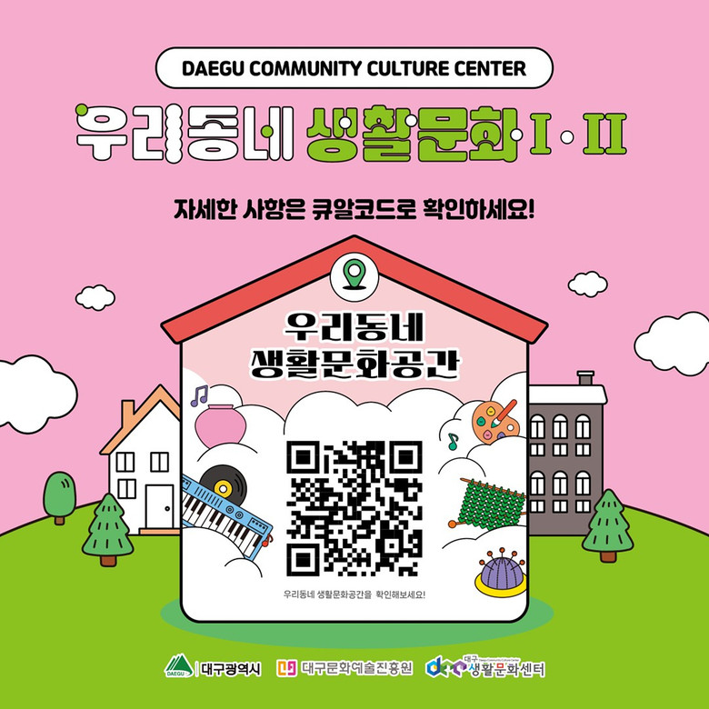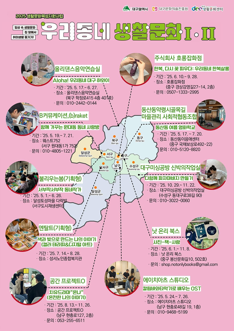 ‘우리동네 생활문화Ⅰ·Ⅱ’운영 프로그램은 공간별 계획된 일정으로 진행되며, 대구시민 누구나 공간별 사전 신청을 통해 참여할 수 있다. 자세한 내용은 대구생활문화센터(www.dccc.or.kr) 누리집 공지 사항에서 확인할 수 있다.
