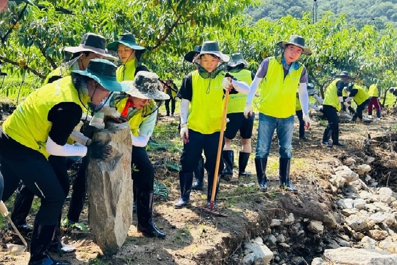지난 28일(금) 농협생명은 △마케팅부문 부사장 △임직원 등 30여 명이 폭우로 큰 피해를 입은 충남 청양군 소재의 과수농가를 찾아 밭에 쌓여 있는 부유물 제거와 인근 유실도로 정비 작업을 도왔다.