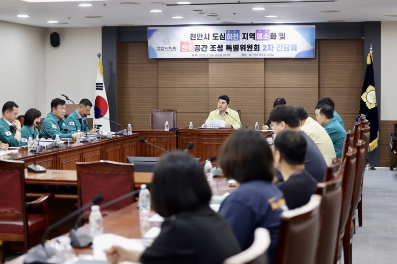 [천안시 세계타임즈=이현진 기자] 천안시의회(의장 김행금)는 25일(금)에 ‘도심하천 지역명소화 및 친수공간 조성 특별위원회’(대표의원 이병하) 제2차 간담회를 개최했다. 이날 간담회에서는 하천과, 하수시설과, 환경정책과, 건설도로과, 정원녹지과, 건축과 등 총 6개 부서로부터 도심하천 관련 추진사업과 개선 과제에 대한 보고가 이뤄졌다.