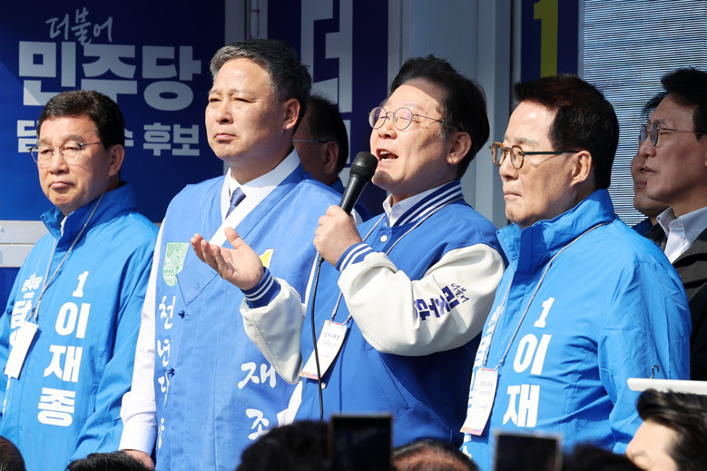 [담양 세계타임즈 = 심귀영 기자] 더불어민주당 이재명 대표가 22일 오전 전남 담양군 중앙공원 사거리에서 이재종 후보 지원 유세를 하고 있다. 2025.3.22