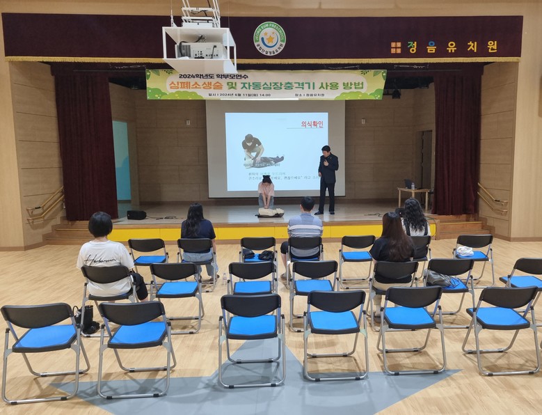 [의정부시 세계타임즈=송민수 기자] 의정부 정음유치원(원장 김연숙)은 6월 11일(화) 학부모를 대상으로‘심폐소생술 및 자동심장충격기 사용 방법’연수를 실시했다.