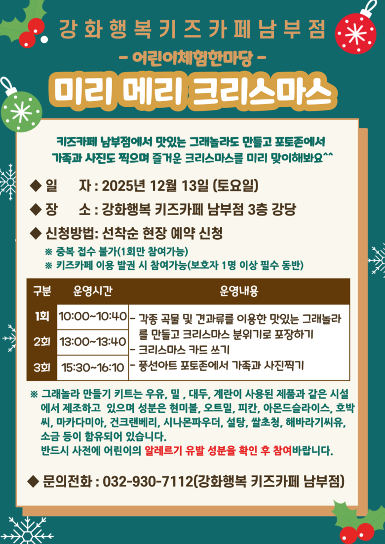 이번 프로그램은 관내·외 어린이들에게 창의적 체험의 기회를 제공하고 가족이 함께 즐길 수 있는 연말 문화행사를 마련하고자 기획됐으며, ▲그래놀라 만들기 ▲크리스마스 카드 쓰기 ▲크리스마스 장식 풍선아트 포토존 등 다양한 체험활동으로 구성된다.