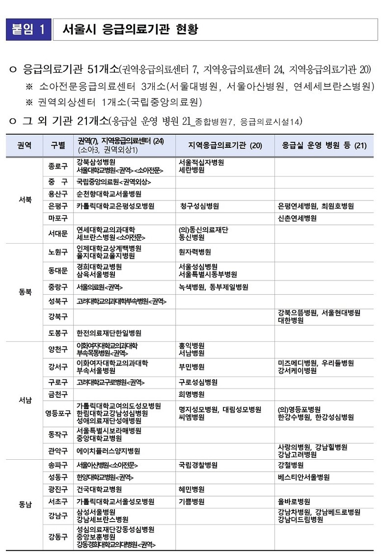 소아 환자를 위한 ‘우리아이 안심병원’ 8개소, ‘우리아이 전문응급센터’ 3개소도 24시간 운영된다. 소아 경증환자의 외래진료는 ‘우리아이 안심의원’ 10개소와 ‘달빛어린이병원’ 18개소에서 받을 수 있다.