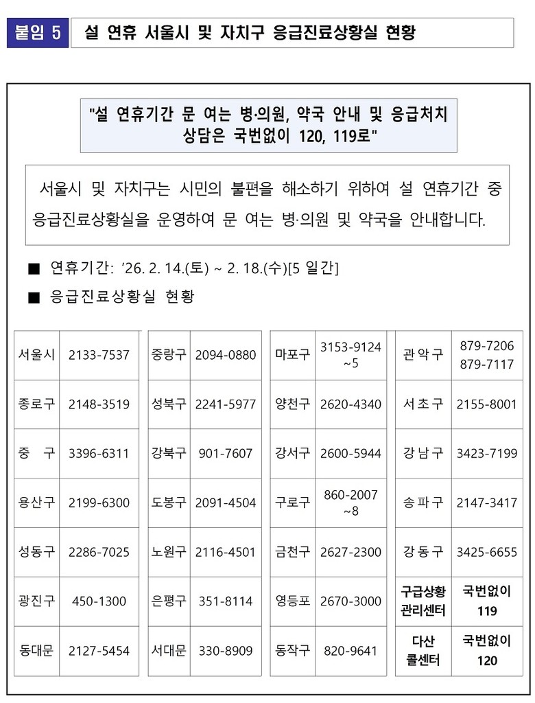 연휴 기간 문 여는 병의원·약국 등 의료기관 운영 정보는 서울시 ‘2026 설 연휴 종합정보’ 누리집(seoul.go.kr/story/newyearsday)과 25개 자치구 누리집에서 확인할 수 있다. 모바일 앱 ‘손목닥터 9988’과 ‘응급의료정보제공(e-gen)’에서도 볼 수 있으며, 국번 없이 120(다산콜센터), 119(구급상황 관리센터)로 연락하면 정보를 안내받을 수 있다.