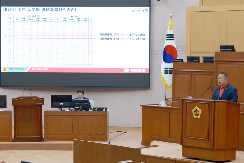 이한영 의원은 먼저 대규모 저층주거지가 조성된 월평동과 만년동 등 일대는 1990년대 초 조성된 계획도시임에도 불구하고, 그동안 도시정비와 정책의 사각지대에 머무르며 심각한 노후화가 진행되고 있다는 점을 지적했다. 실제로 대전시 전체 단독주택의 약 70% 이상이 20년 이상 된 노후주택이며, 노후 저층주거지 주민들은 누수, 단열 미비, 침수피해 등의 문제에 지속적으로 노출되어 있다.