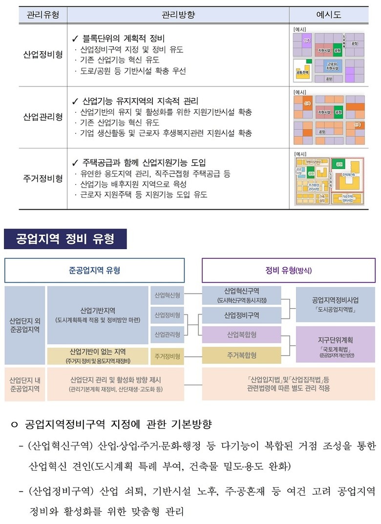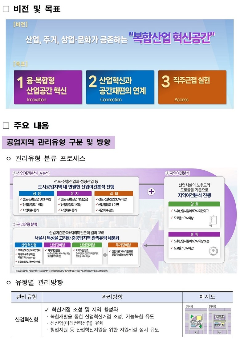 서울시는 지역 특성을 고려해 공업지역을 유형별로 구분하고, 산업혁신구역 등 공업지역정비사업과 ’24년 11월 발표한 ‘준공업지역 제도 개선방안’ 산업.주거복합형 지구단위계획 등 정비방식을 연계 적용함으로써 공업지역을 종합적이고 효율적으로 관리.운영할 계획이다.