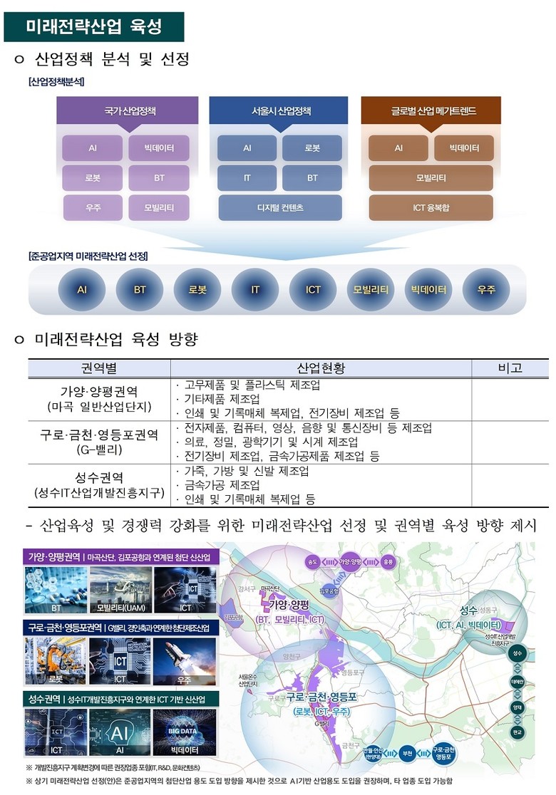 - (구로.금천.영등포권역) G밸리 및 경인축 산업 기반을 활용해 로봇, ICT, 우주 관련 첨단 제조산업 육성