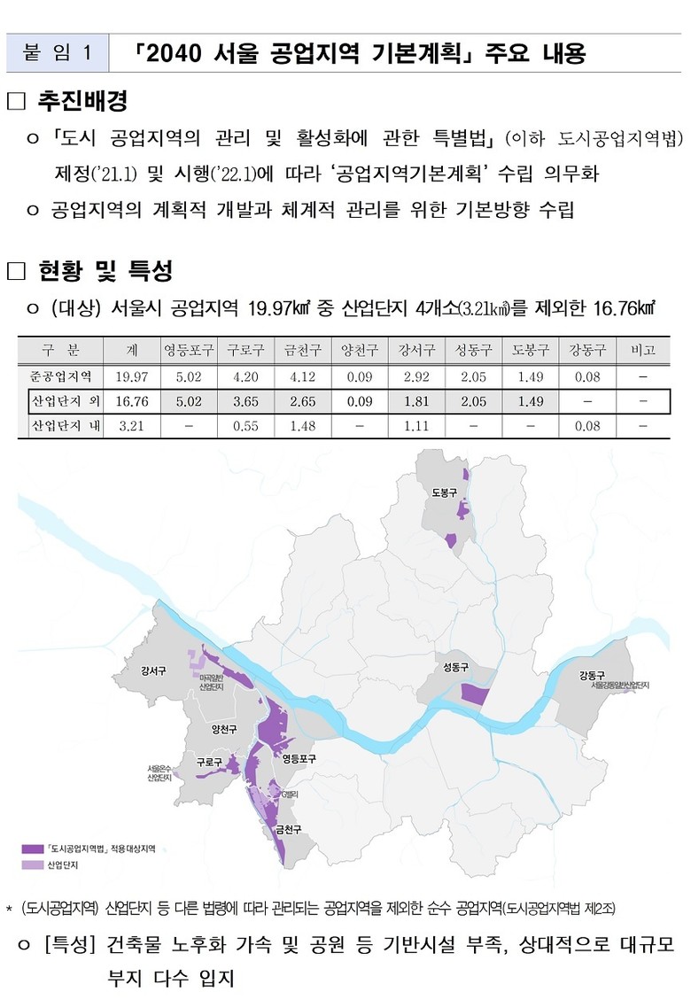 「2040 서울 공업지역 기본계획」은 서울시가 발표한 ‘서남권 대개조’의 후속 실행계획으로, 노후 공업지역이 집중된 서남권을 중심으로 준공업지역을 미래 지향적 신산업 거점으로 재편하고, 서울 전역 공업지역의 중장기 관리 방향을 제시하는 법정 최상위 계획이다.