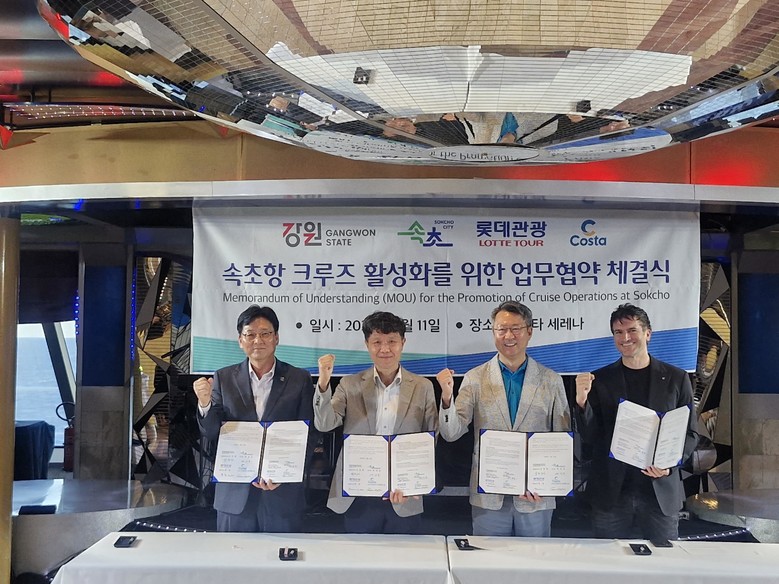 [강원도 세계타임즈=김민석 기자] 강원특별자치도(도지사 김진태)는 9월 11일(목) 속초항에 입항한 코스타 세레나호 선상에서 속초시, 롯데관광, 코스타크루즈와 함께 속초항을 거점으로 한 크루즈 활성화 업무협약을 체결했다고 밝혔다.