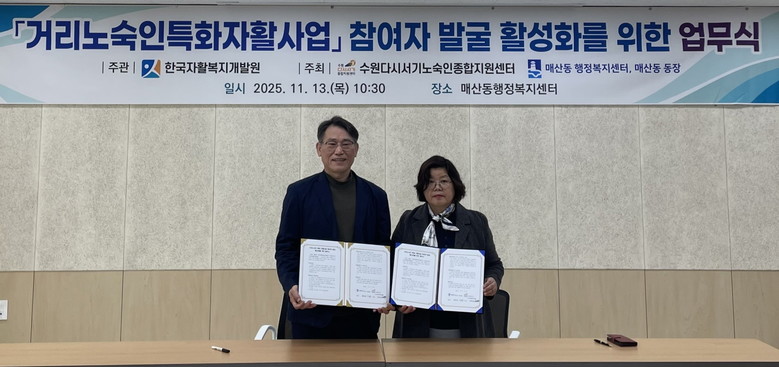 이번 협약은 노숙인 및 주거취약계층의 자립·자활 지원체계 강화를 목표로 추진됐으며, 두 기관은 상호 협력을 통해 참여자 발굴, 복지 연계, 취업 지원 등 다각적인 지원을 확대하기로 했다. 매산동 행정복지센터는 지역 내 복지 사각지대 해소를 위해 거리 상담 및 현장 발굴 활동을 강화하고, 수원다시서기 노숙인종합지원센터는 자활 프로그램, 직업훈련, 사례관리 등을 통해 실질적인 자립을 돕게 된다.