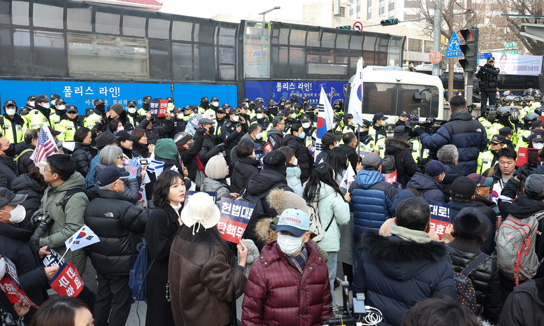[세계타임즈 = 이장성 기자] 21일 오후 탄핵심판 변론기일에 윤석열 대통령이 출석하자 헌법재판소 일대에 모여든 지지자들은 격앙됐다.윤 대통령은 법무부 호송용 승합차를 타고 이날 낮 12시 48분께 경기 의왕시 서울구치소 정문을 출발해 오후 1시 11분께 서울 종로구 헌재에 도착했다.경찰은 윤 대통령에 대한 구속영장이 발부된 19일 새벽 서울서부지법에서 발생한 폭력 사태의 재발을 막기 위해 만반의 준비를 한 모습이었다.현장에 배치된 일부 경찰 기동대원은 헬멧과 방패, 진압복을 착용하고 캡사이신 분사기를 준비하는 등 만일의 사태에 대비했다.