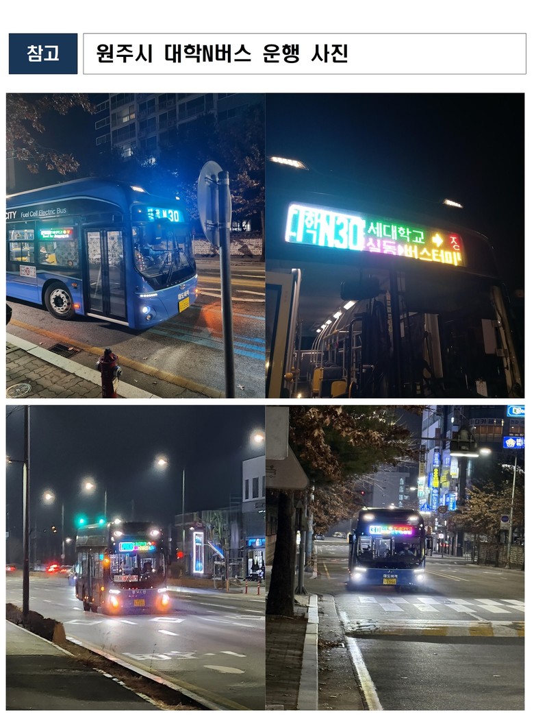 이에 더해 시는 지난 2월 주요 대학가와 도심지역, 중고등학교, 원주역을 자정까지 연장 운행하는 심야버스 노선(30번·90번)인 ‘대학N버스’를 신설했다.