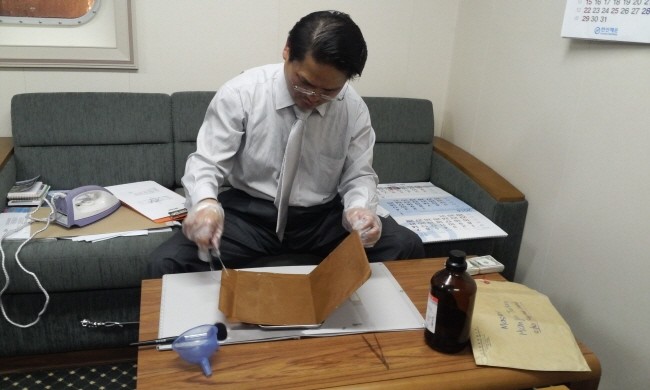 (사진=범죄현장에서 분말기법과 화학기법으로 현출한 지문을 선원 22명의 지문과 대조 분석 하는 장면)