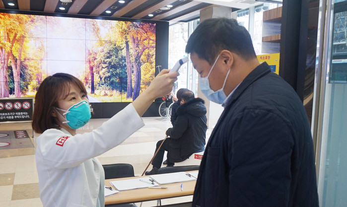 | ▲우한 폐렴의 확산이 우려되고 있는 가운데 서울 서남부권 종합병원 에이치플러스 양지병원 의료진들이 1월28일 오전 8시부터 병원 방문하는 내원 환자 전원을 대상으로 출입구에서 체온을 측정하고 있다. 이 병원은 오늘부터 입원병동 환자 보호자를 제외한 모든 방문객의 면회를 전면 제한하고 병원 출입문과 지하주차장 등에 대한 통제를 강화했다. <사진=H+양지병원 제공> |