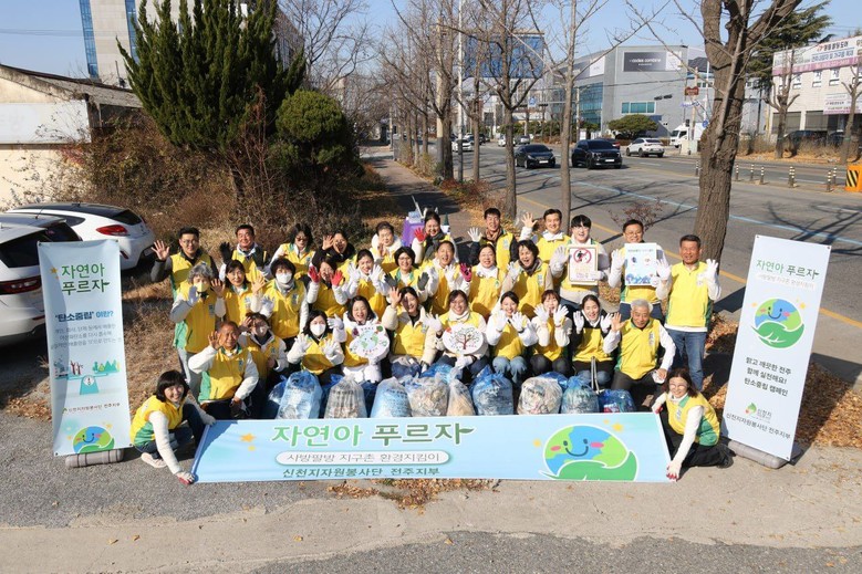 전주지부는 ‘자연아 푸르자’ 현수막과 손팻말을 들고 시민들에게 환경 보전과 탄소중립 실천의 중요성을 알렸다. 또 활동 현장에서 봉사단 조끼를 착용하고 장갑, 집게, 분리용 봉투 등을 활용해 쓰레기를 체계적으로 수거했다.