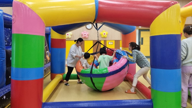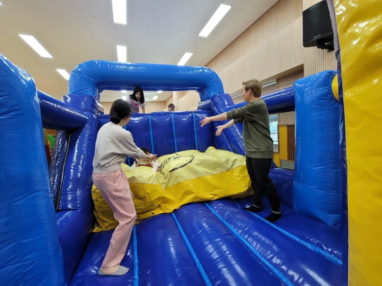 슬링백(가방선물)은 추후 ‘우리 마을을 깨끗하게 하기 위한 운동-줍깅’ 행사와 연계 할 예정이다. 또한 실내 강당에서는 ‘에어바운스 체험’을 진행하였는데 안전한 놀이체험이 될 수 있도록 20여 명의 학부모가 자발적으로 도우미로 지원하여 유아들의 안전을 도왔다.