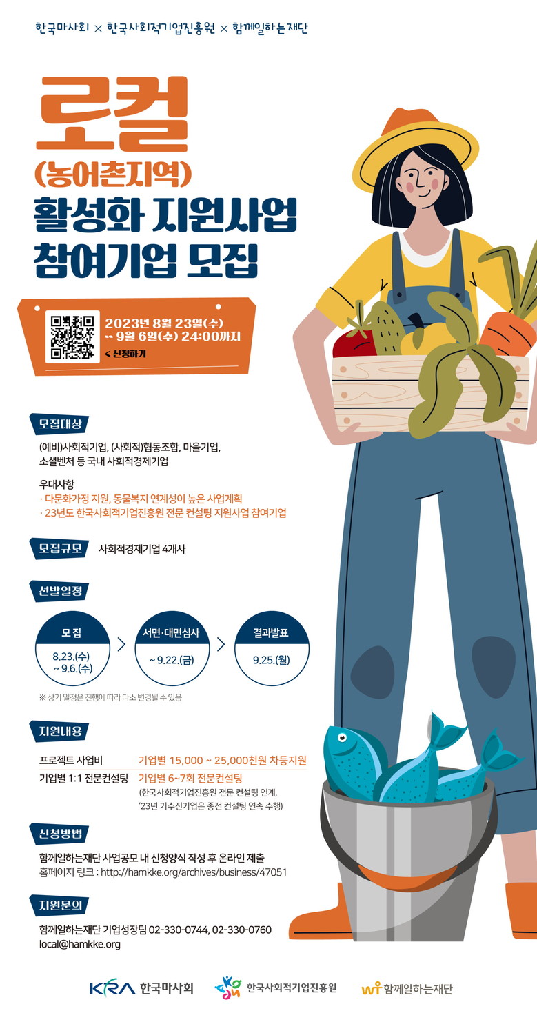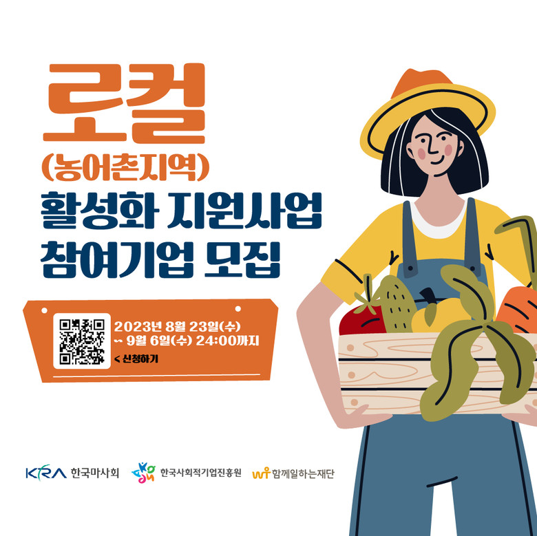 [세계타임즈 = 송민수 기자] 한국마사회(회장 정기환)는 함께일하는재단(이사장 이세중), 한국사회적기업진흥원(원장 정현곤)과 함께 “2023년도 로컬(농어촌지역) 활성화 지원사업”(이하 지원사업)에 참여할 사회적경제기업을 8월 23일부터 9월 6일까지 모집한다고 밝혔다.