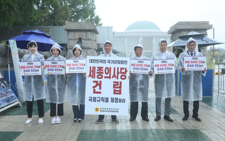 이날 미래전략수도완성특별위원회 위원들은 비가 쏟아지는 상황 속에서도 꿋꿋하게 세종의사당 건립 국회규칙 제정 촉구 피켓 캠페인을 이어 갔다.