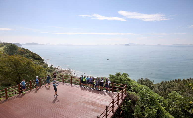 | ▲ 거금도 해안을 달리던 자전거 동호인들이 전망 좋은 지점에서 기념사진 활영하는 모습 |