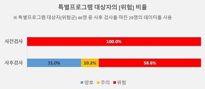 특히, 위험군을 대상으로 진행한 특별프로그램 대상자의 41.3%(12명)는 마음건강 상태가 ‘위험’에서 ‘양호’ 또는 ‘주의’ 수준까지 완화된 것으로 분석됐다.