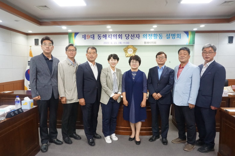 제9대 의회 의원당선자는 8명(가선거구: 최이순, 이동호, 안성준, 나선거구: 김향정, 이창수, 최명관, 정동수, 국민의힘 비례대표 민귀희)으로 의정설명회가 마친 뒤 당선인들은 한자리에 모여 첫인사와 함께 지역발전과 시민복리증진을 위해 서로 소통하고 협치하며 동해시 발전을 위해 최선을 다할 것을 다짐했다.