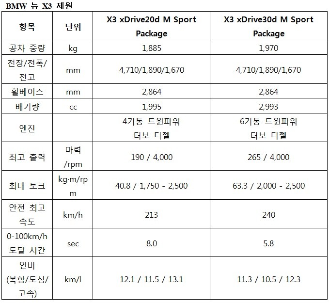 뉴 X3 xDrive30d의 3리터 직렬 6기통 디젤 엔진은 265마력의 최고출력을 내고, 2,000~2,500rpm에서 63.3kg·m의 최대토크를 낸다. 100km/h까지의 가속 시간은 5.8초, 최고 속도는 240km/h이다. 복합 연비는 11.3km/l이며, 이산화탄소 배출량은 175g/km다.