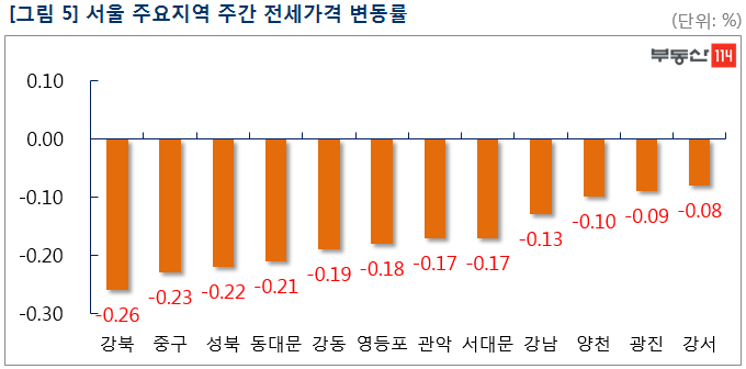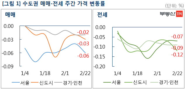 부동산114(www.r114.com)에 따르면 금주 서울 아파트 매매가격 변동률은 -0.06%로 집계됐다. 재건축 아파트는 -0.14%로 한 주전(-0.09%)에 비해 낙폭을 다시 키웠다. 이밖에 신도시는 -0.03% 경기·인천은 -0.02%의 하락률을 기록했다. 전세가격은 서울이 0.07% 떨어졌고 신도시와 경기·인천은 각각 -0.12%, -0.09%로 약세 행진을 계속했다.