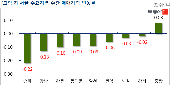 서울은 ▼송파(-0.22%) ▼강남(-0.13%) ▼강동(-0.10%) ▼동대문(-0.09%) ▼양천(-0.09%) ▼관악(-0.06%) 순으로 하락했다. 송파는 잠실동 일대 트리지움, 리센츠 등 대단지 아파트값이 중소형 면적 위주로 1,000만원-2,500만원씩 일제히 떨어졌다. 가격을 낮춘 매물이 나와도 거래는 거의 없는 상황이다.