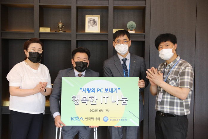 한국마사회 관계자는 “IT기기 기증을 통해 정보취약계층의 정보격차해소에 이바지함은 물론 기기의 폐기 대신 재활용을 통한 환경보호와 비용절감의 효과도 함께 볼 수 있다.”고 밝혔다. 기증식에 참석한 한국IT복지진흥원 정일섭 원장은 “코로나19로 비대면수업 및 활동이 증가함에 따라 취약계층과 학생들에게 기증된 기기들을 전달해 우리사회 정보격차와 교육격차를 줄이는데 힘쓰겠다.”고 밝혔다.