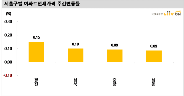 서울(0.03%)은 지난주(0.02%)에 이어 최근 6주간 약 상승세를 보이고 있다. 광진구(0.15%), 성북구(0.10), 중랑구(0.09%), 성동구(0.09%) 등은 상승하였고 보합(0.00%)인 지역이 다수 있으며 하락 지역은 없다.