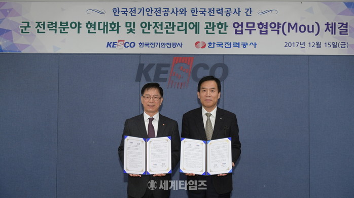[나주=세계타임즈 양준호 기자]한국전력이 한국전기안전공사와 '군 전력분야 현대화 및 안전관리'를 위한 협약을 15일 체결했다고 밝혔다.