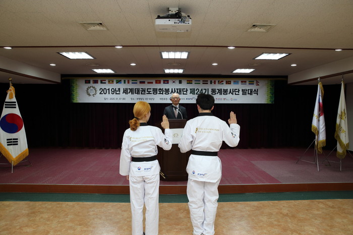 이날 발대식에는 세계태권도평화봉사재단 이중근 총재를 대신한 신명호 이사를 비롯해 재단 임직원, 교육연수원장, 봉사단원 등 100여명이 참석했다.