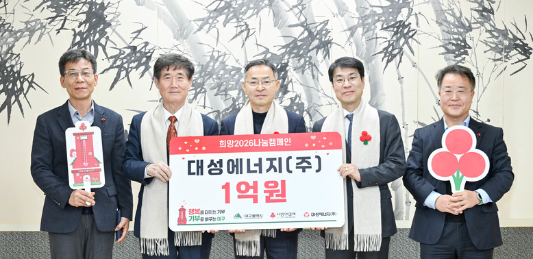 ▸ ‘희망2026 나눔 캠페인’ 통해 대구사회복지공동모금회에 성금 전달 [세계타임즈=대구 한윤석 기자] 대성에너지㈜는 12월 11일(목) 오후 2시 30분, 대구광역시청 산격청사에서 ‘희망2026 나눔 캠페인’ 성금 1억 원을 대구사회복지공동모금회에 전달했다.