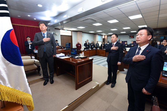 [양구군=세계타임즈 김민석 기자] 양구군의회 제256회 임시회 개회식 및 제1차 본회의가 4일 의회 본회의장에서 조인묵 군수, 이상건 의장, 박귀남부의장 및 의원, 김광진 부군수, 실과소장이 참석한 가운데 열렸다.