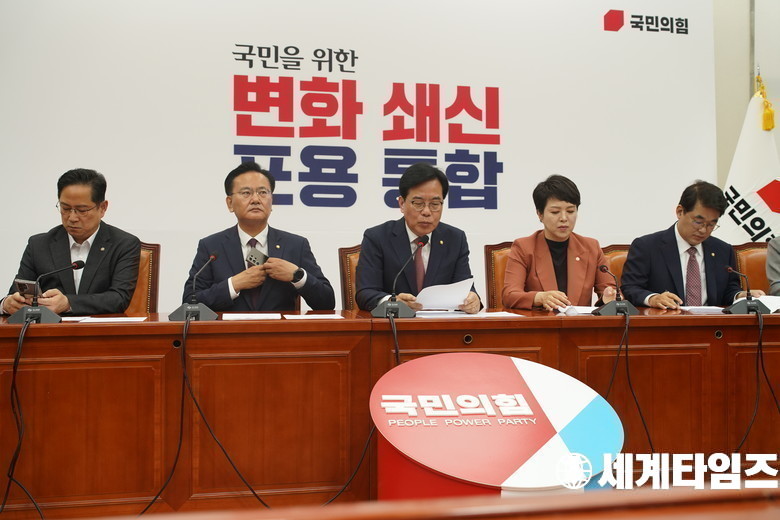 '국민의힘' 의원들이 24일 오전 서울 여의도 국회에서 열린 원내대책회의에서 발언하고 있다.