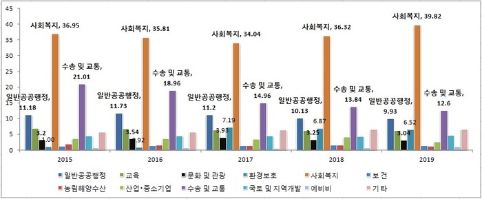 - 사회복지, 수송 및 교통, 일반 공공행정의 순으로 매년 예산을 투입을
