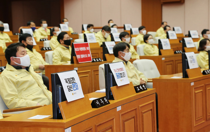 코로나19 감염 확산 방지를 위해 시의회는 본회의장 입구에 체온측정기와 손소독제를 비치했으며 시의원들은 민방위복과 일반 면마스크를 착용하고 본회의장에 착석했다.